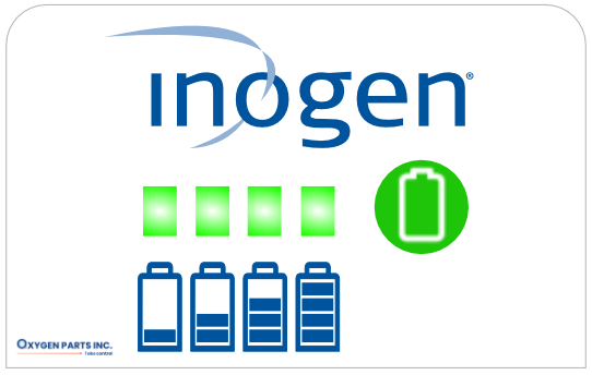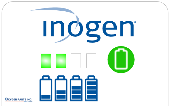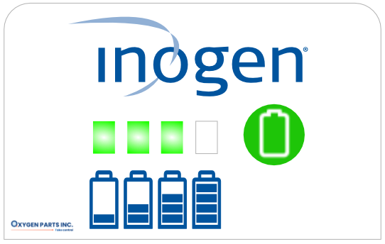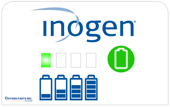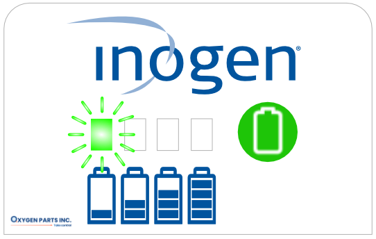 To check how much charge is remaining on your Inogen G5 battery when it’s not installed in the concentrator, press the green battery icon button. There are four battery lights indicating less than 10% to 100% which will light up to the left of the green battery button to show the level of charge remaining in the battery.